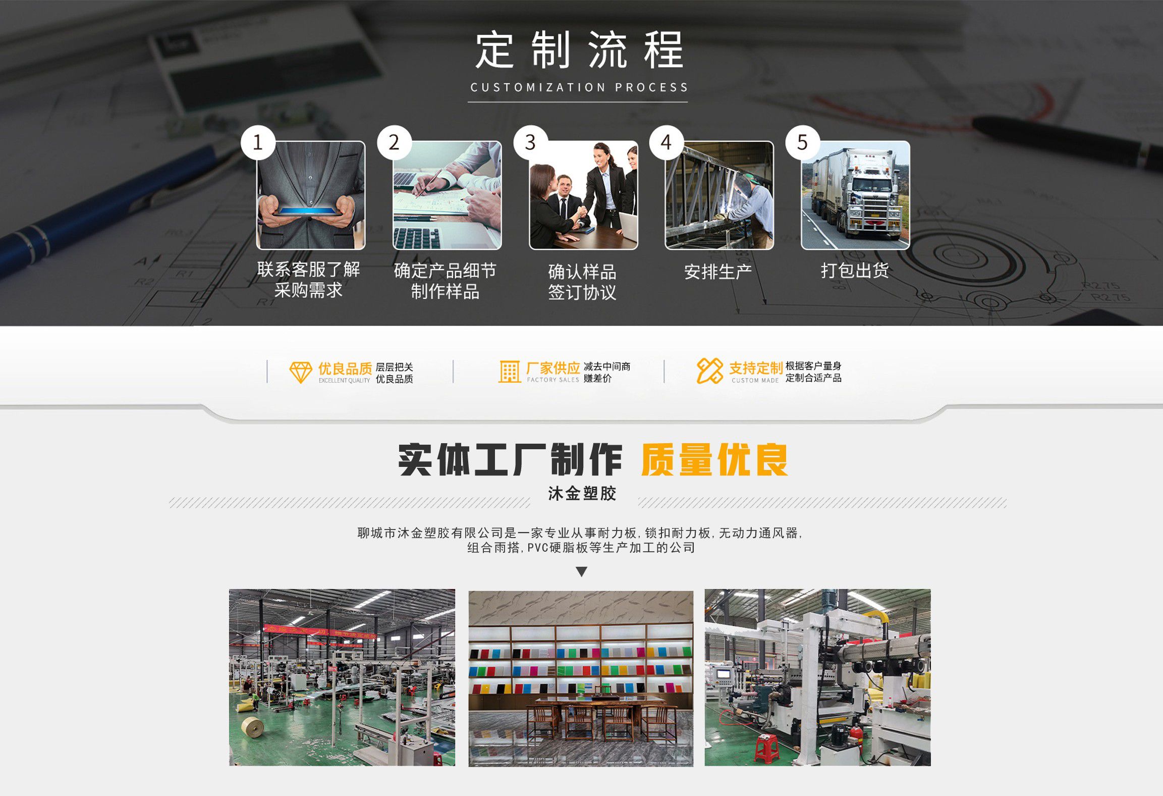 聊城市沐金塑膠有限公司注冊(cè)資金2180萬元,占地20000余平方,擁有自建廠房15000平方,員工100余名。10余年來,公司主營(yíng)耐力板,鎖扣耐力板,耐力板深加工,無動(dòng)力通風(fēng)器,組合雨搭,PVC硬脂板,耐力板廠家等板材的發(fā)展戰(zhàn)略,逐漸成長(zhǎng)為綜合性企業(yè)。  公司擁有多條板材共擠生產(chǎn)線,采用世界知名品牌進(jìn)口原材料和先進(jìn)工藝,依據(jù)完善的ISO9001質(zhì)量管理體系和ISO14001環(huán)境管理體系,為產(chǎn)品的卓越品質(zhì)提供了強(qiáng)有力的保證。憑借過硬的創(chuàng)新能力和堅(jiān)實(shí)的硬件基礎(chǔ),贏創(chuàng)已成為國(guó)內(nèi)領(lǐng)先的熱塑性板材生產(chǎn)商,產(chǎn)品被廣泛應(yīng)用于建筑業(yè)、農(nóng)業(yè)、工業(yè)、廣告業(yè)、安防行業(yè)及DIY領(lǐng)域。  公司始終致力于通過提供最優(yōu)的板材應(yīng)用解決方案,為客戶創(chuàng)造最高的價(jià)值;堅(jiān)守創(chuàng)新、質(zhì)量、靈活、服務(wù)和速度的核心價(jià)值觀;堅(jiān)持“完美的產(chǎn)品需要完美服務(wù)的支持”的經(jīng)營(yíng)理念,努力實(shí)現(xiàn)成為世界領(lǐng)先的板材與解決方案供應(yīng)商的夢(mèng)想。  在未來,公司將立足客戶需求,不斷改變和完善現(xiàn)有產(chǎn)品,拓展產(chǎn)品線和充分開發(fā)板材的應(yīng)用領(lǐng)域,為客戶創(chuàng)造全方位的價(jià)值。同時(shí)更好地實(shí)現(xiàn)員工的價(jià)值,實(shí)現(xiàn)公司團(tuán)隊(duì)的價(jià)值。我們將與您一起創(chuàng)贏未來!  企業(yè)使命:成為世界領(lǐng)先的板材與解決方案供應(yīng)商。  公司愿景:通過提供最優(yōu)的板材應(yīng)用解決方案,為客戶創(chuàng)造最高的價(jià)值。  核心價(jià)值觀:質(zhì)量...